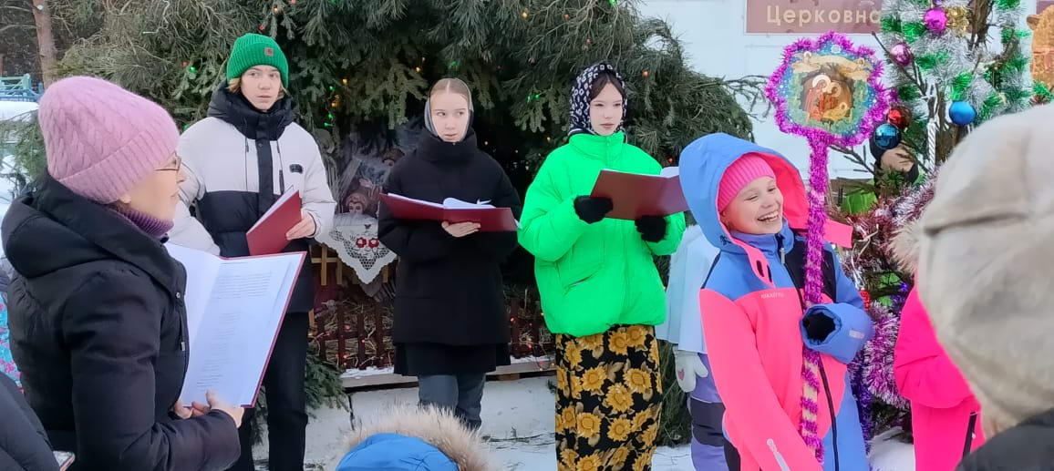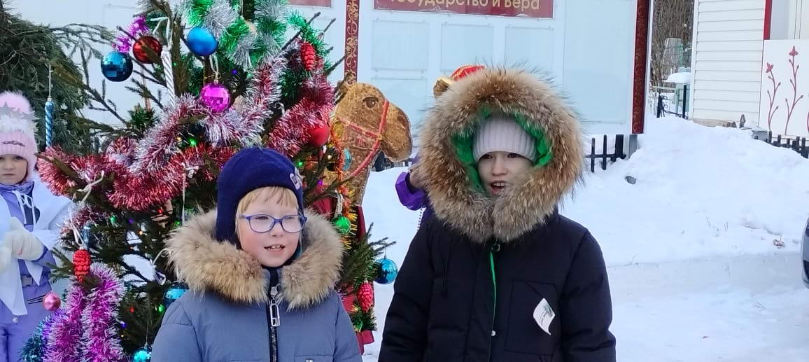 Представление продолжилось на улице возле вертепа и ёлки. Ведущие праздника: Алексей Бурундуков, Маша Банникова и Маша Гришина рассказали об истории и событиях тех давних лет, когда на свет появился Спаситель мира - Иисус Христос. Возле вертепа и ёлки дети продолжили читать стихи. Конечно, не обошлось и без хоровода, это уже традиция.