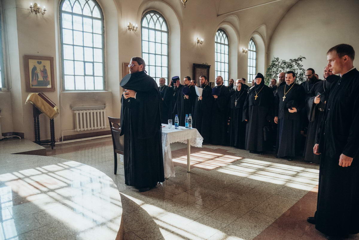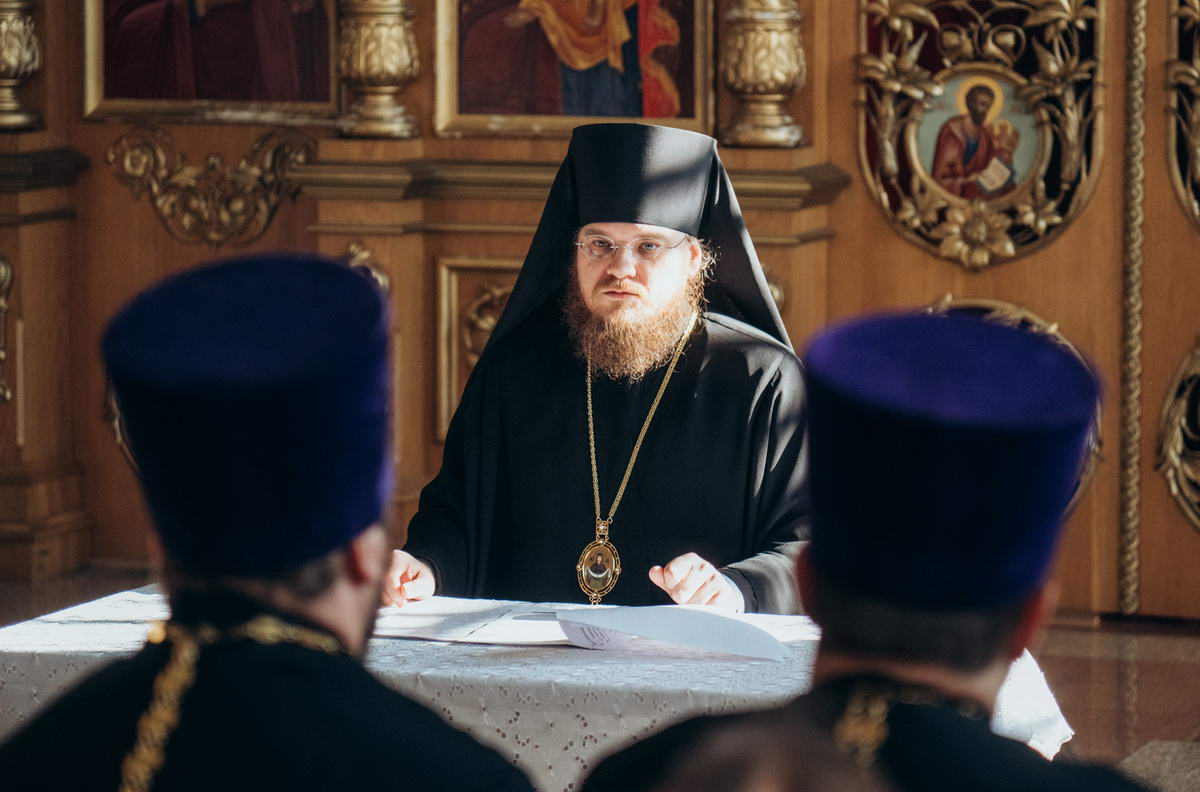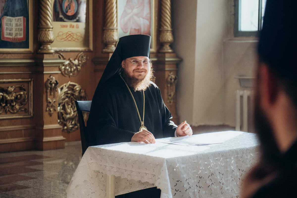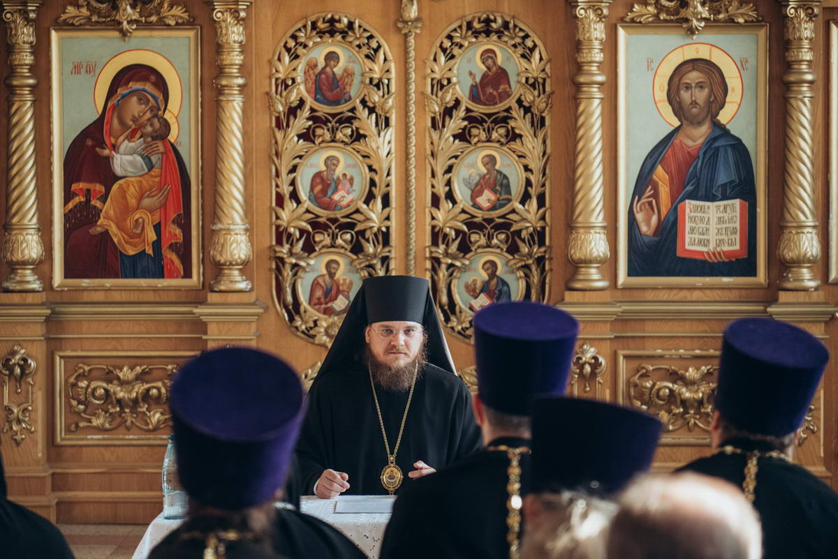 После вступительной молитвы епископ Сергий поприветствовал всех собравшихся. В своём слове Владыка Сергий привел статистические данные по епархии, рассказал о первом посещении благочиний, знакомстве со знаковыми приходами. Преосвященный Сергий высказал пожелания об улучшении ситуации во взаимодействия благочиний с муниципальными образованиями в области религиозного образования, взаимодействие в военными ведомствами и, особенно, в области социального служения.