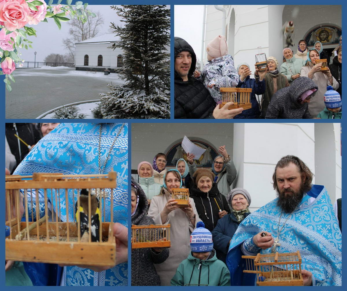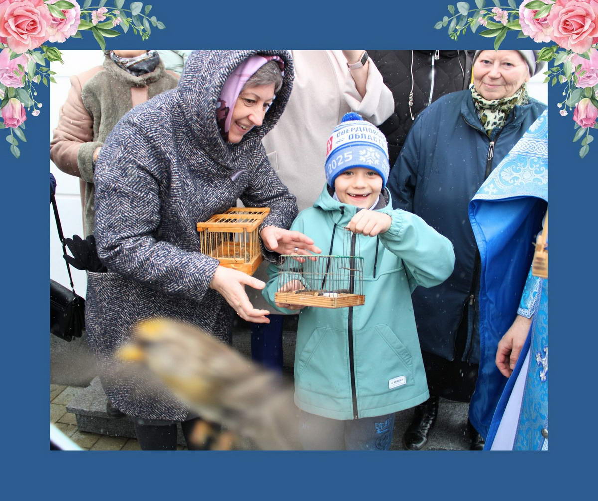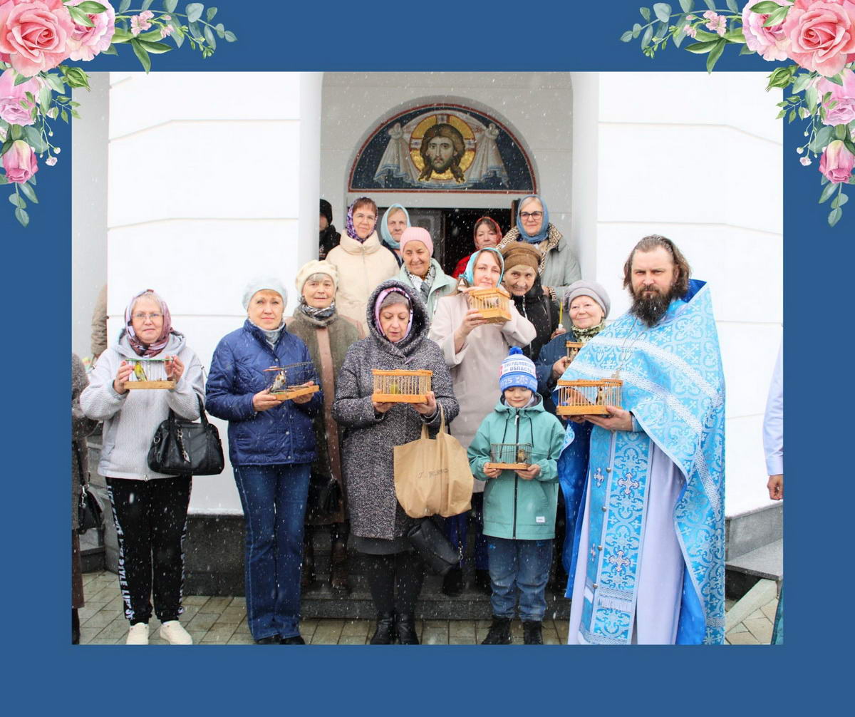 В завершение благодарственных молитв батюшка пригласил всех прихожан поучаствовать в традиции выпускать птиц на волю в этот праздник. Перед тем, как отпустить птиц, Горбунова Т.Г. прочитала стихотворение А.С. Пушкина "Птичка". После все прихожане спели тропарь "Богородице Дева, радуйся".