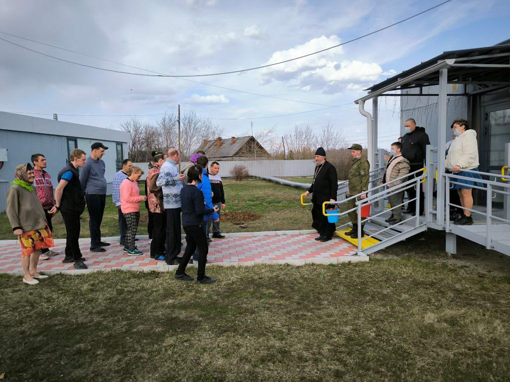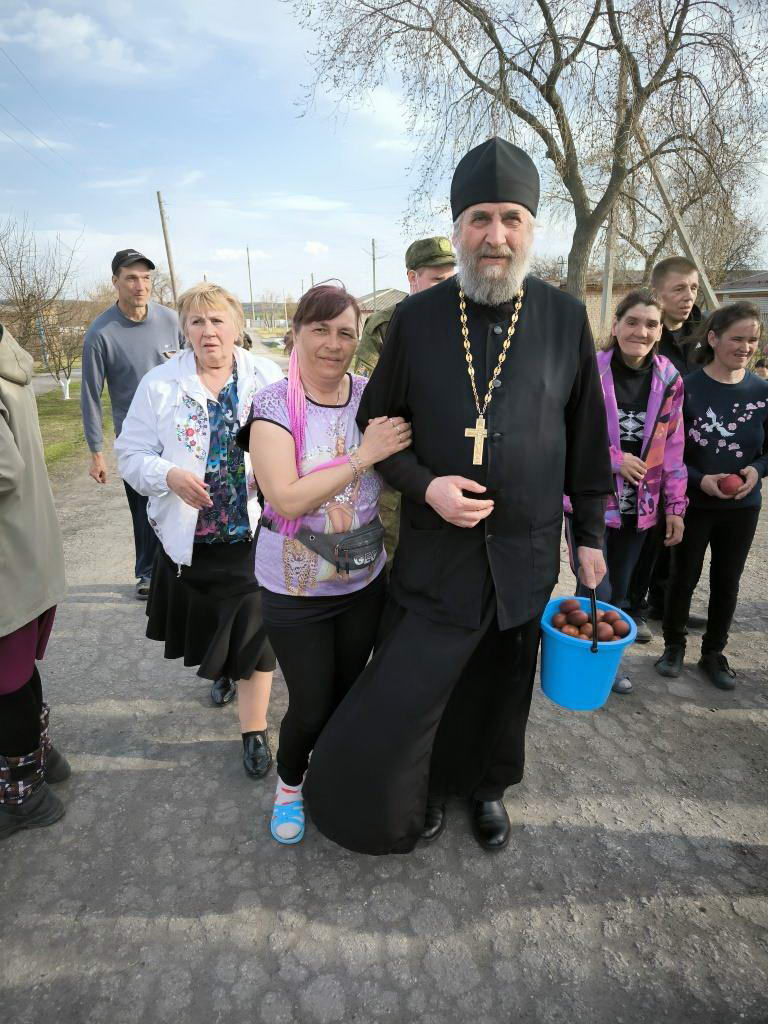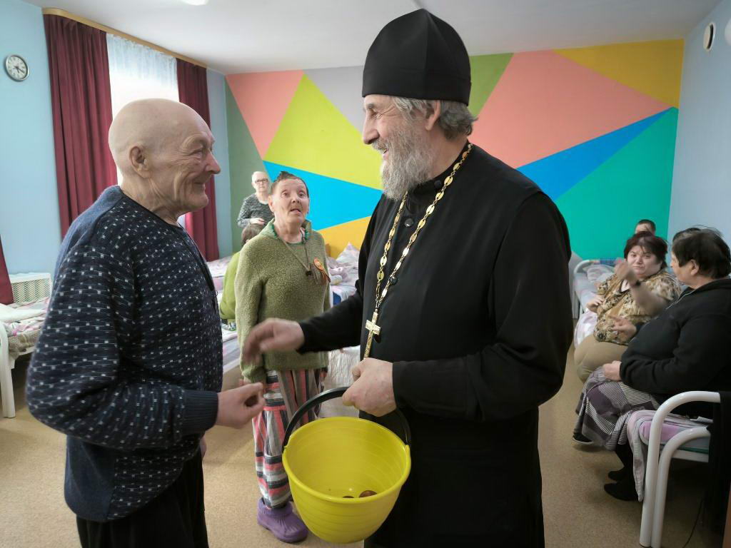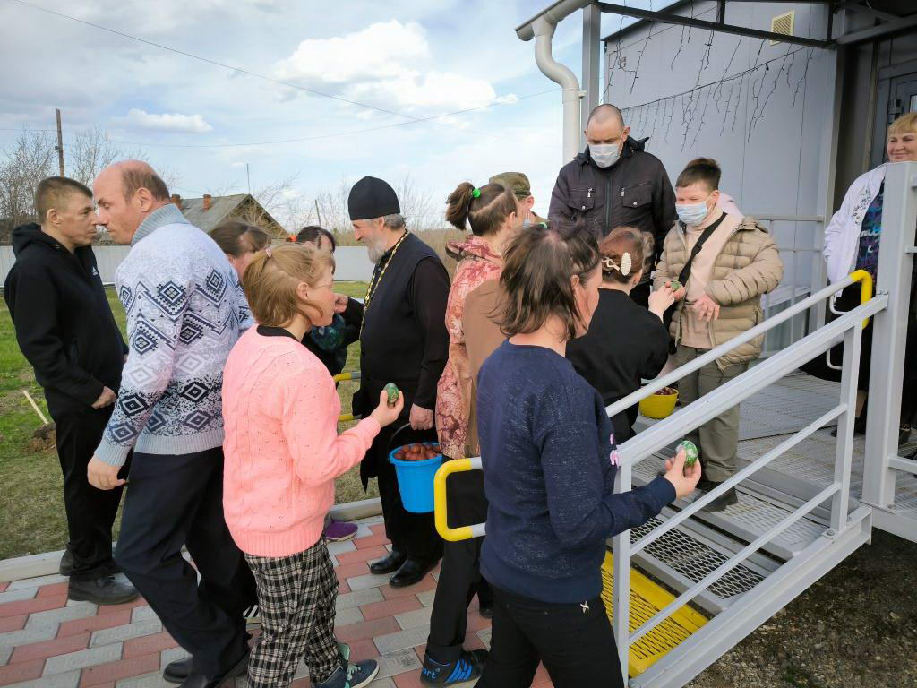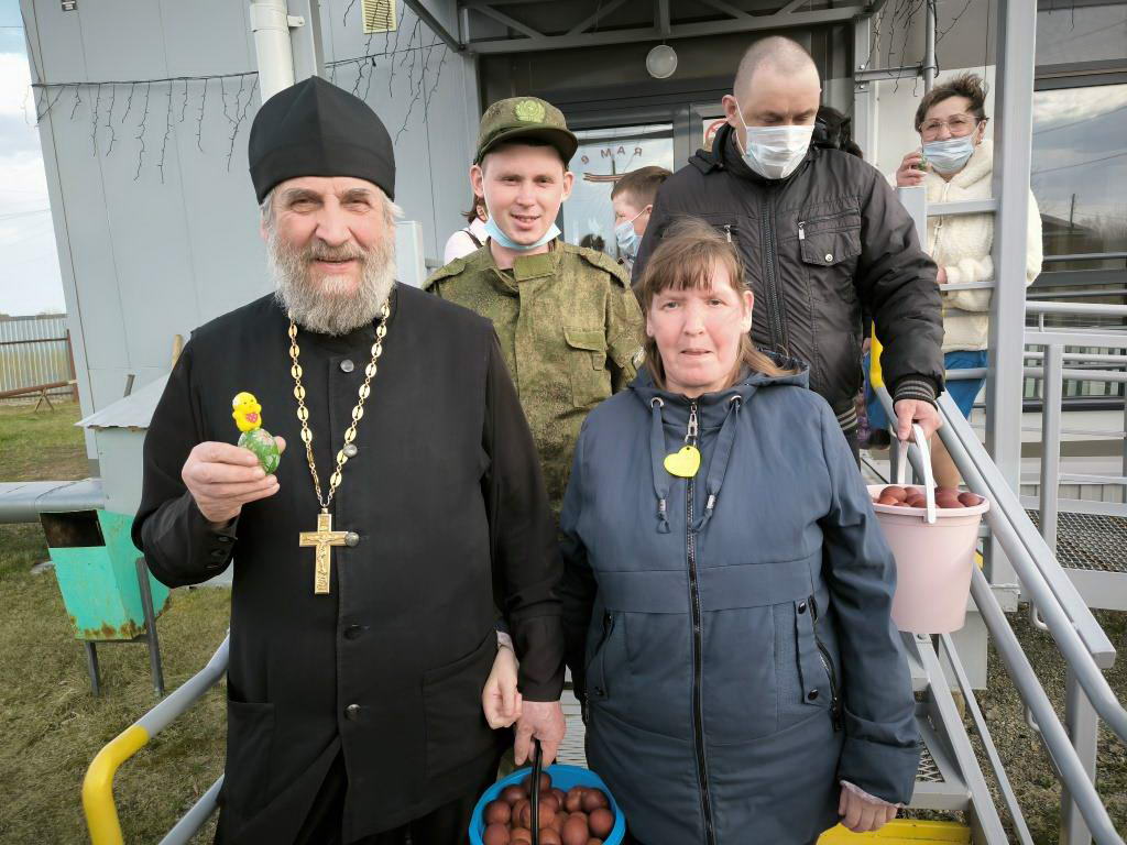 Батюшка вместе с волонтёрами зашли в каждый корпус, поздравили всех со светлым праздником Пасхи, подарили клиентам крашеные яйца и сделали много общих фотографий.