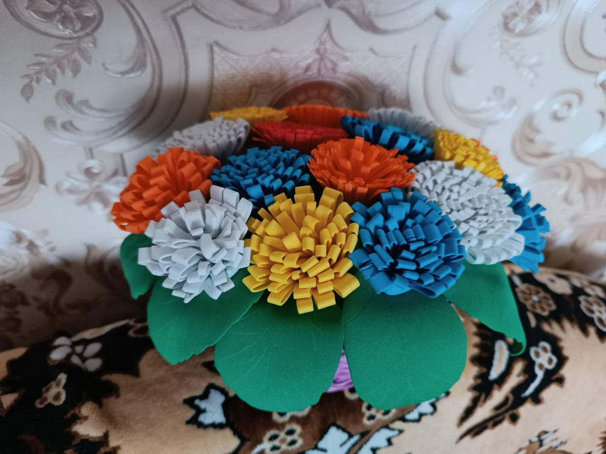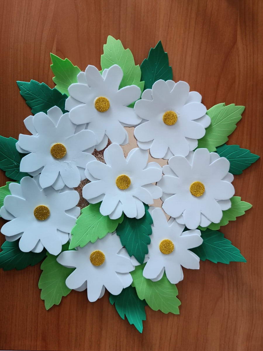 Воспитанники Центра помощи семье и детям, вместе с педагогами нашей воскресной школы, изготовили панно "Ромашки", букет "Цветы в корзине" и цветы на подставке.