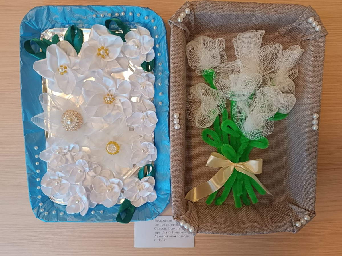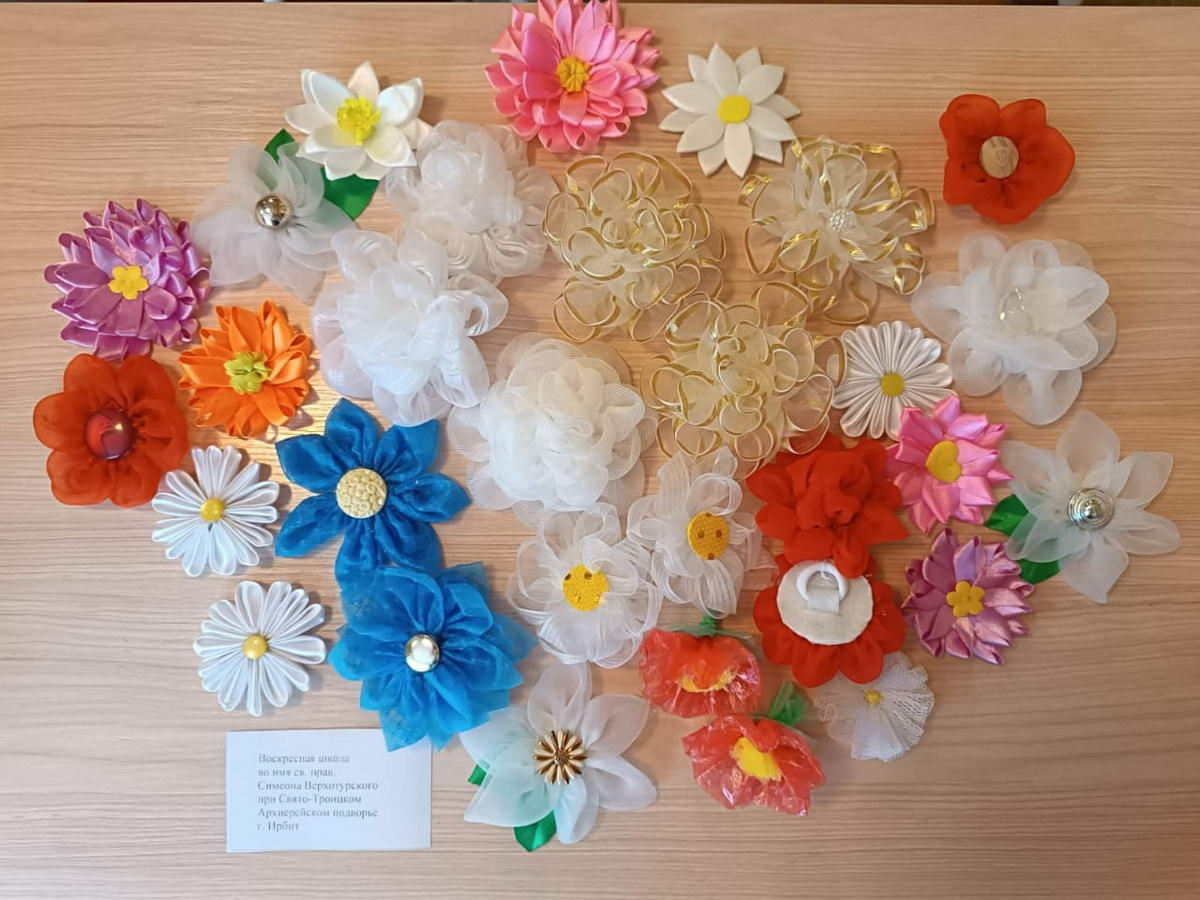 Педагоги воскресной школы изготовили различные поделки: цветы из капроновых лент и из бросового материала, заколки для волос из цветов, панно.