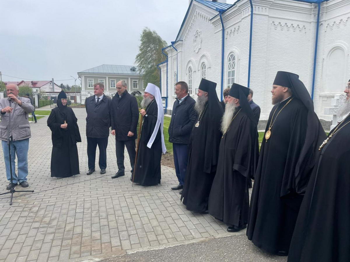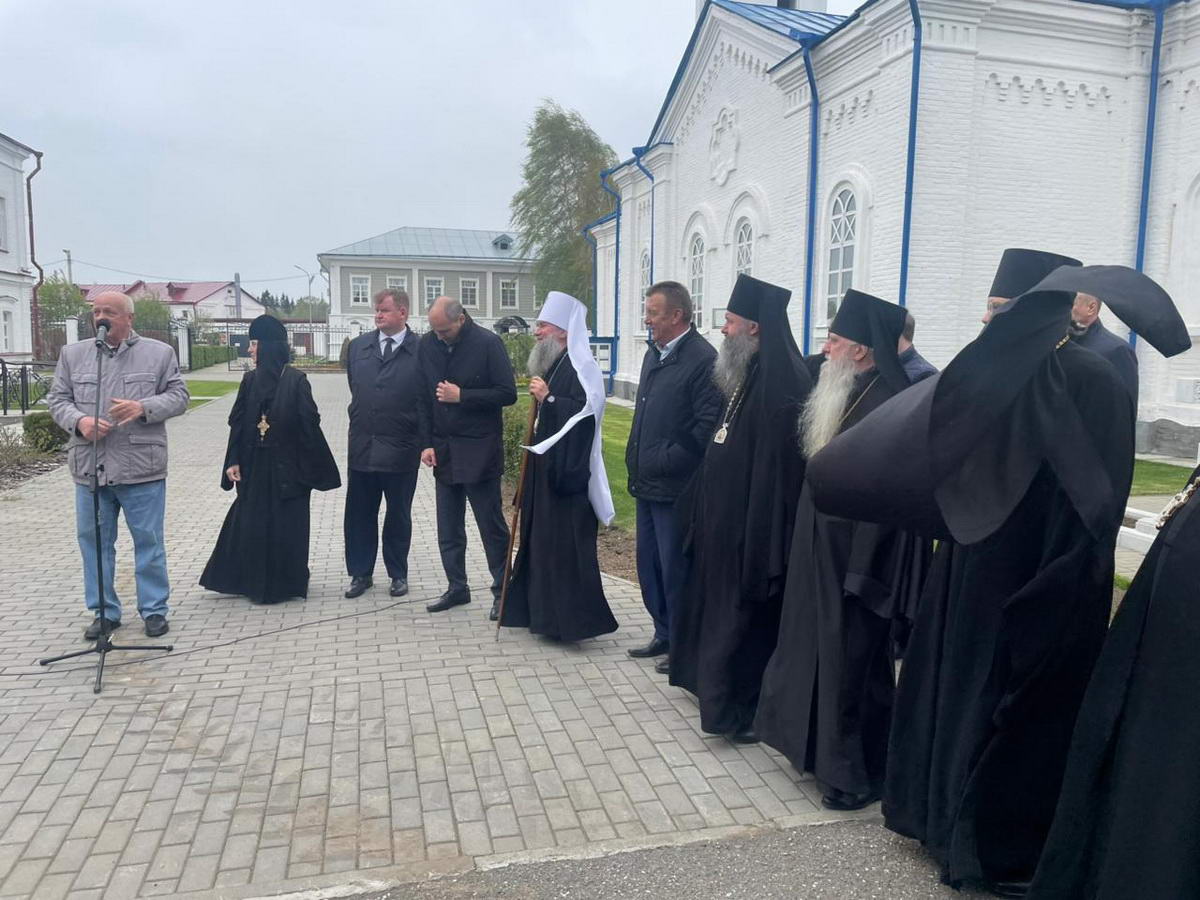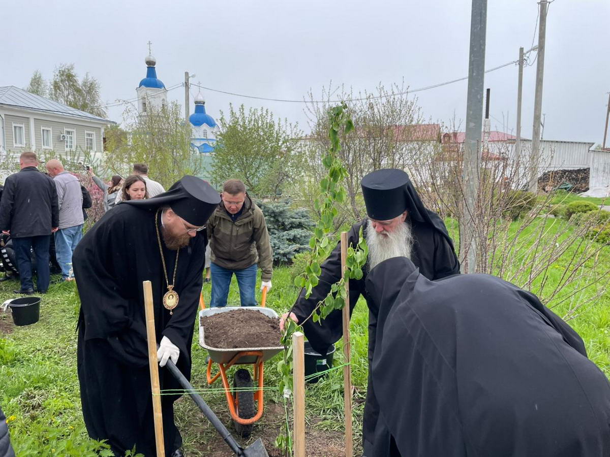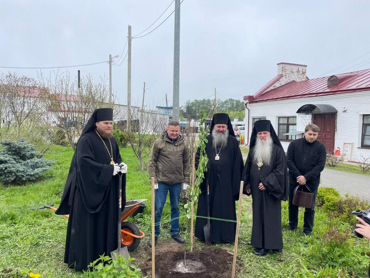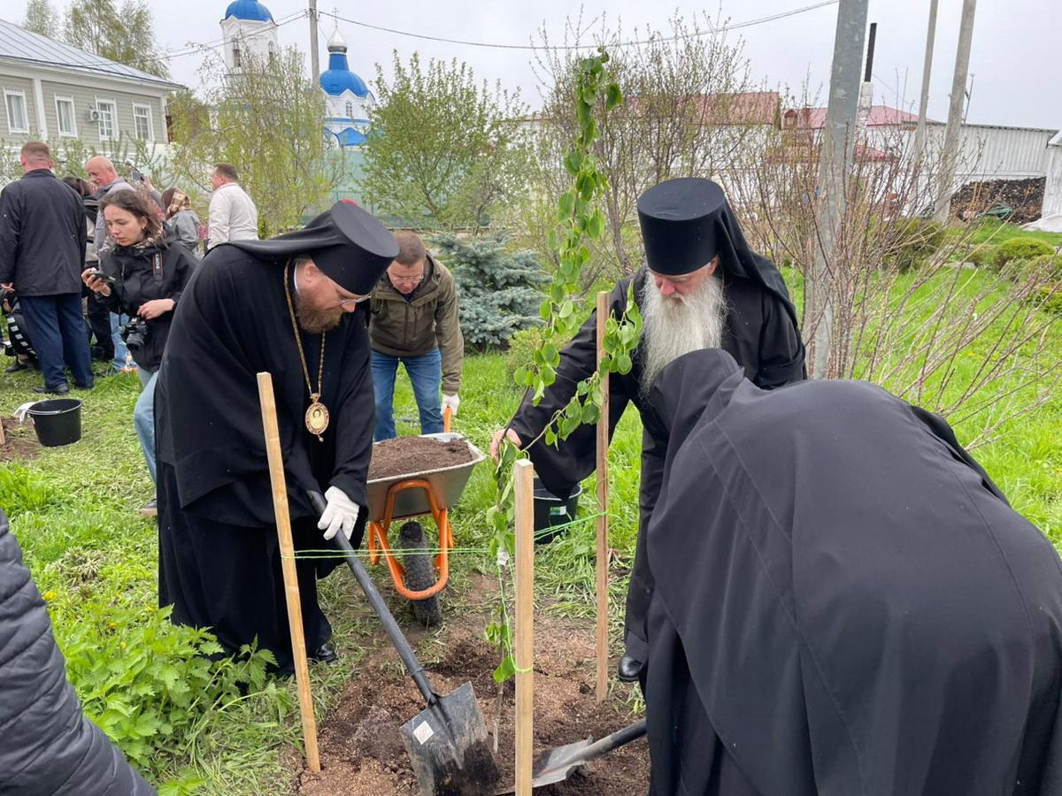Митрополит Евгений и Денис Владимирович Паслер поприветствовали участников добровольческой акции на территории Свято-Покровского женского монастыря, в ходе которой в обители были высажены деревья.