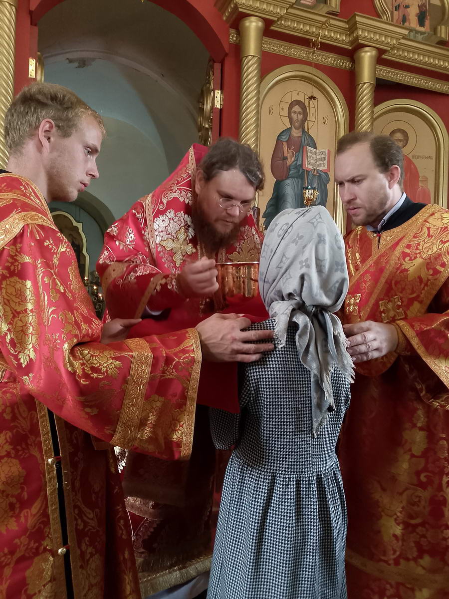 По запричастном стихе проповедь произнес иеромонах Прокопий (Руднев), который напомнил о жизни и мученическом подвиге священномучеников Ионна, Иоасафа и Константина, пострадавших в годы Гражданской войны в с. Мироново.