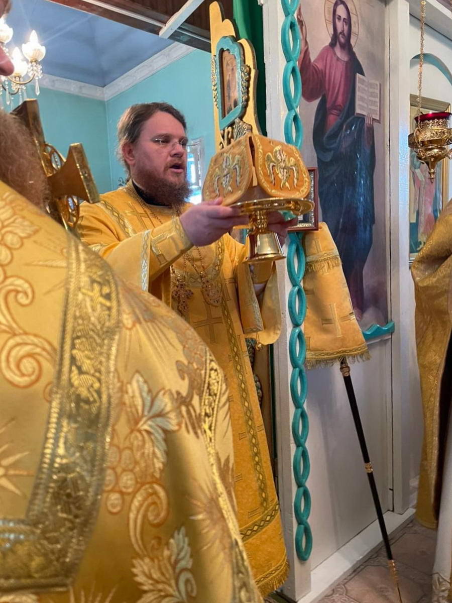 По окончании литургии епископ Сергий обратился к собравшимся с архипастырским словом, в котором более глубоко раскрыл смысл прочитанного сегодня отрывка из Евангелия, после чего вручил настоятелю храма иерею Игорю Аксёнову патриаршую награду - медаль прп. Сергия Радонежского.