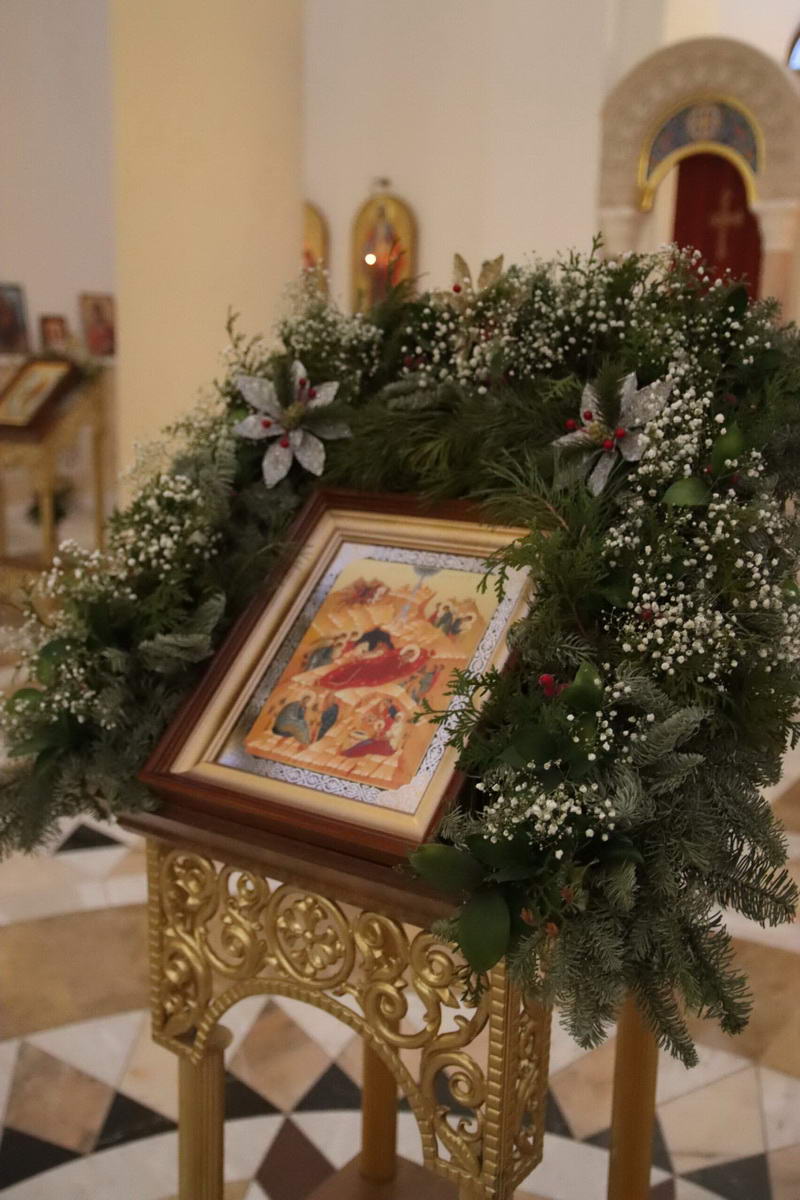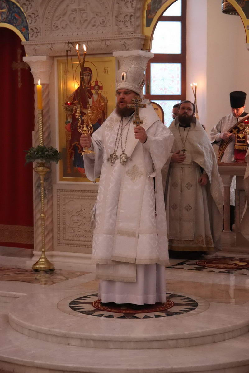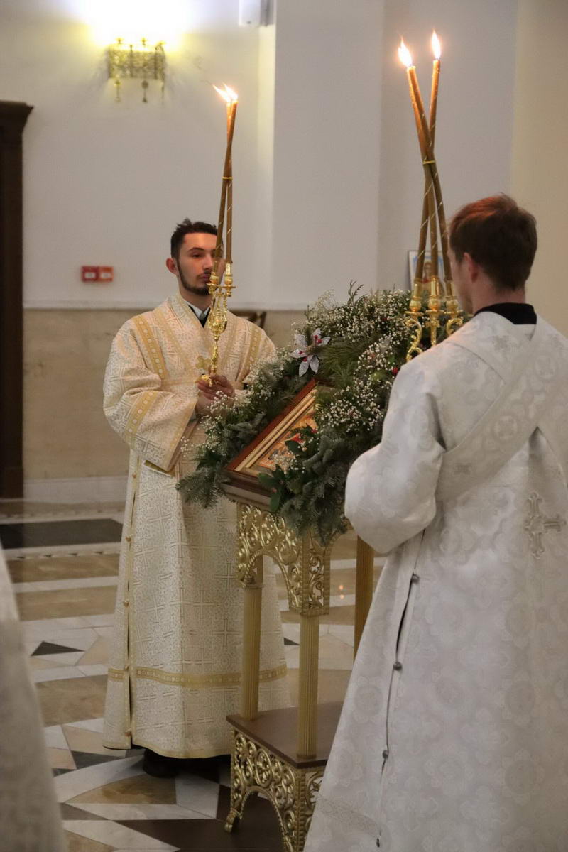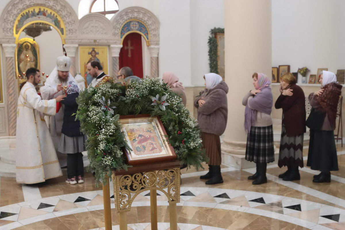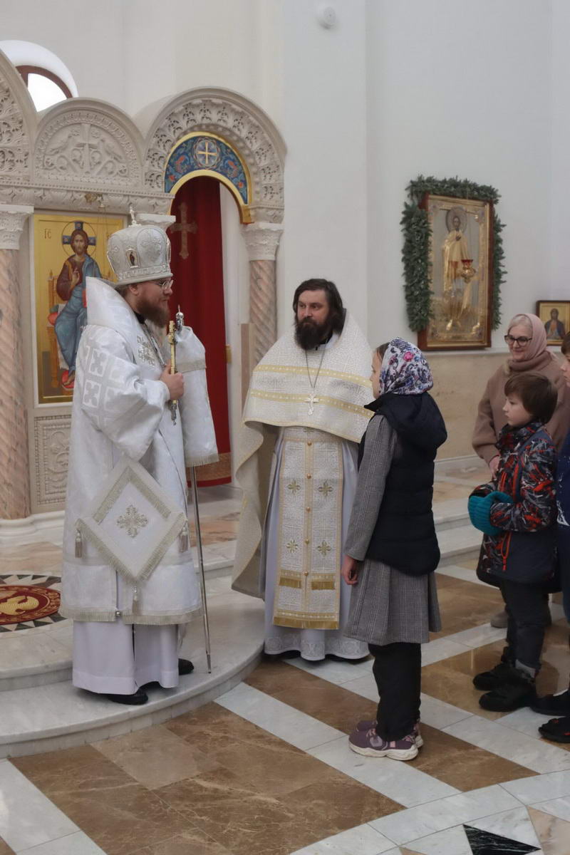 По окончании богослужения епископ Сергий с духовенством перед иконой праздника пропели тропарь и кондак Рождества Христова.