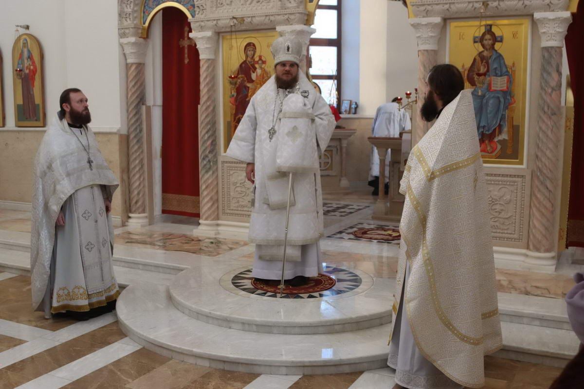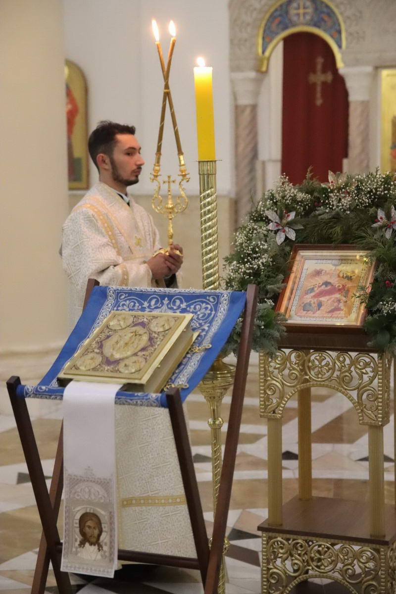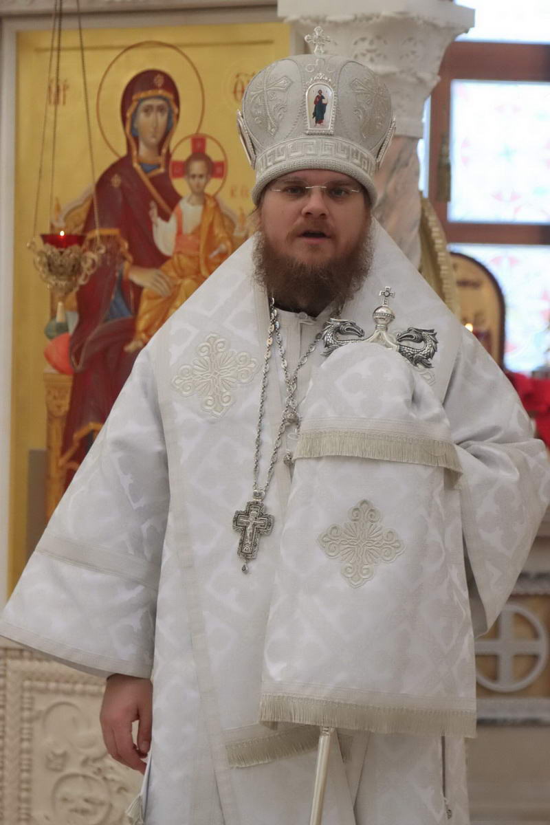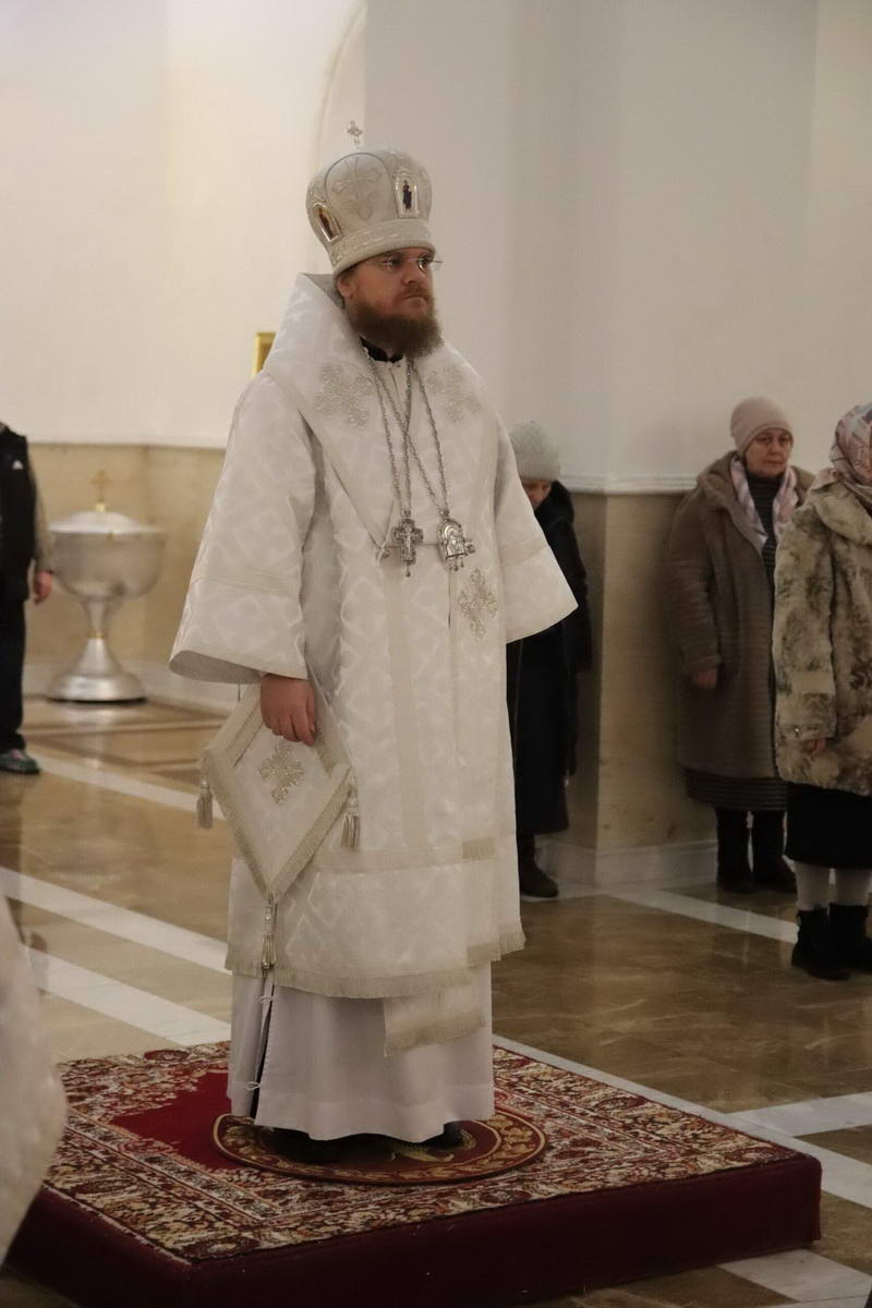 По окончании богослужения епископ Сергий с духовенством перед иконой праздника пропели тропарь и кондак Рождества Христова.