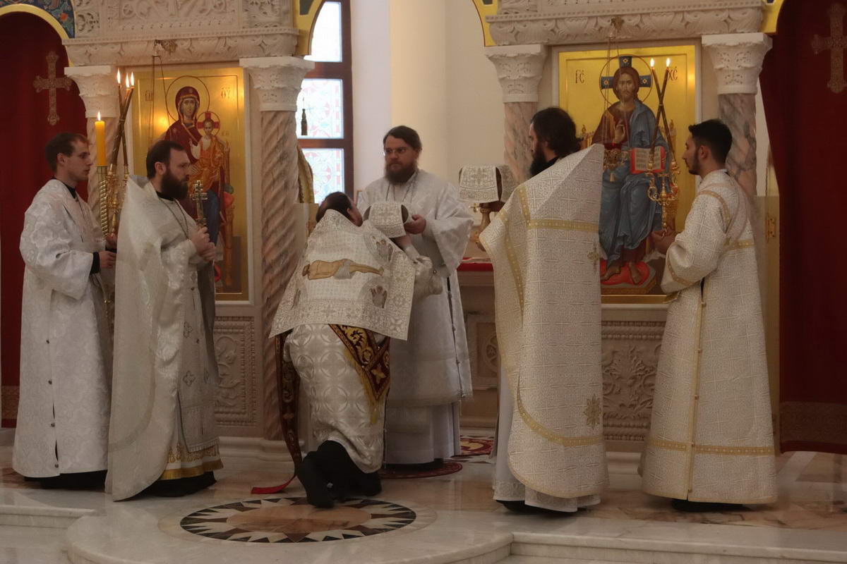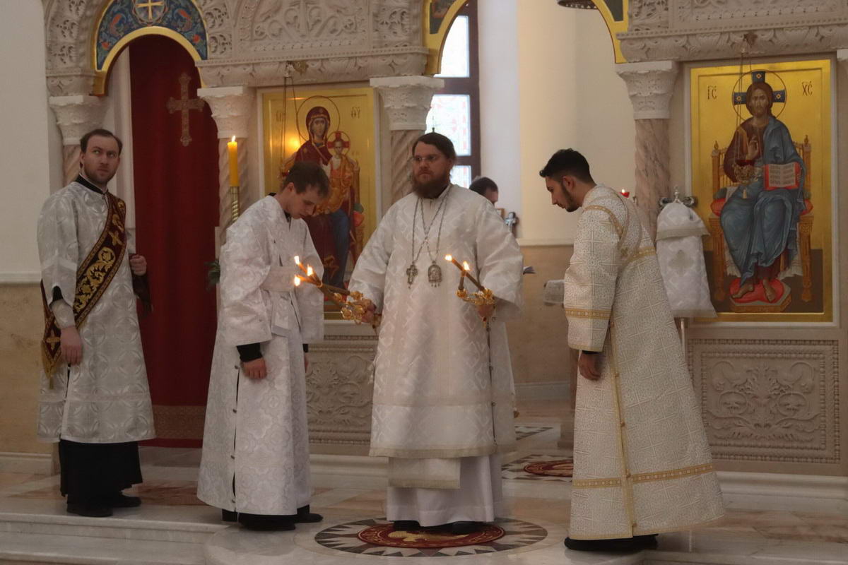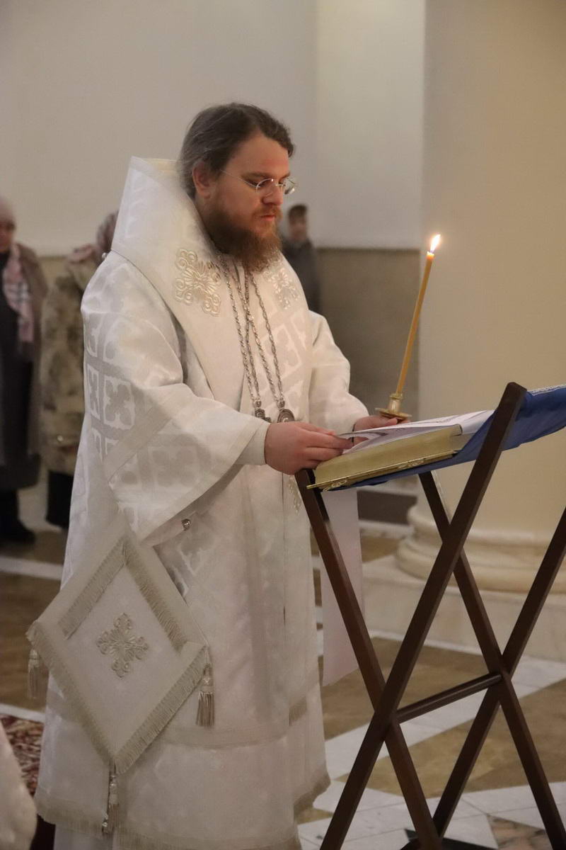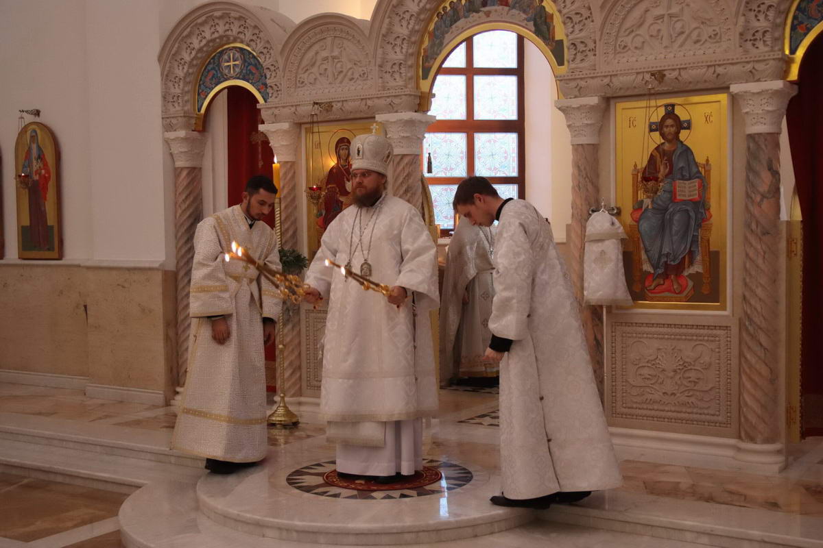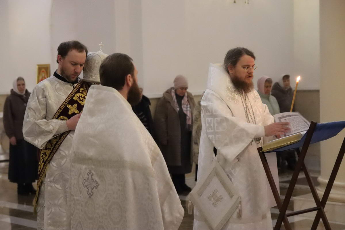 По окончании богослужения епископ Сергий с духовенством перед иконой праздника пропели тропарь и кондак Рождества Христова.