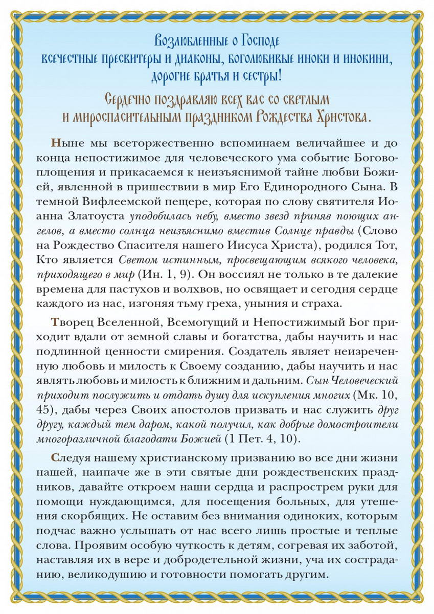 Следуя нашему христианскому призванию во все дни жизни нашей, наипаче же в эти святые дни рождественских праздников, давайте откроем наши сердца и распрострем руки для помощи нуждающимся, для посещения больных, для утешения скорбящих. Не оставим без внимания одиноких, которым подчас важно услышать от нас всего лишь простые и теплые слова. Проявим особую чуткость к детям, согревая их заботой, наставляя их в вере и добродетельной жизни, уча их состраданию, великодушию и готовности помогать другим.