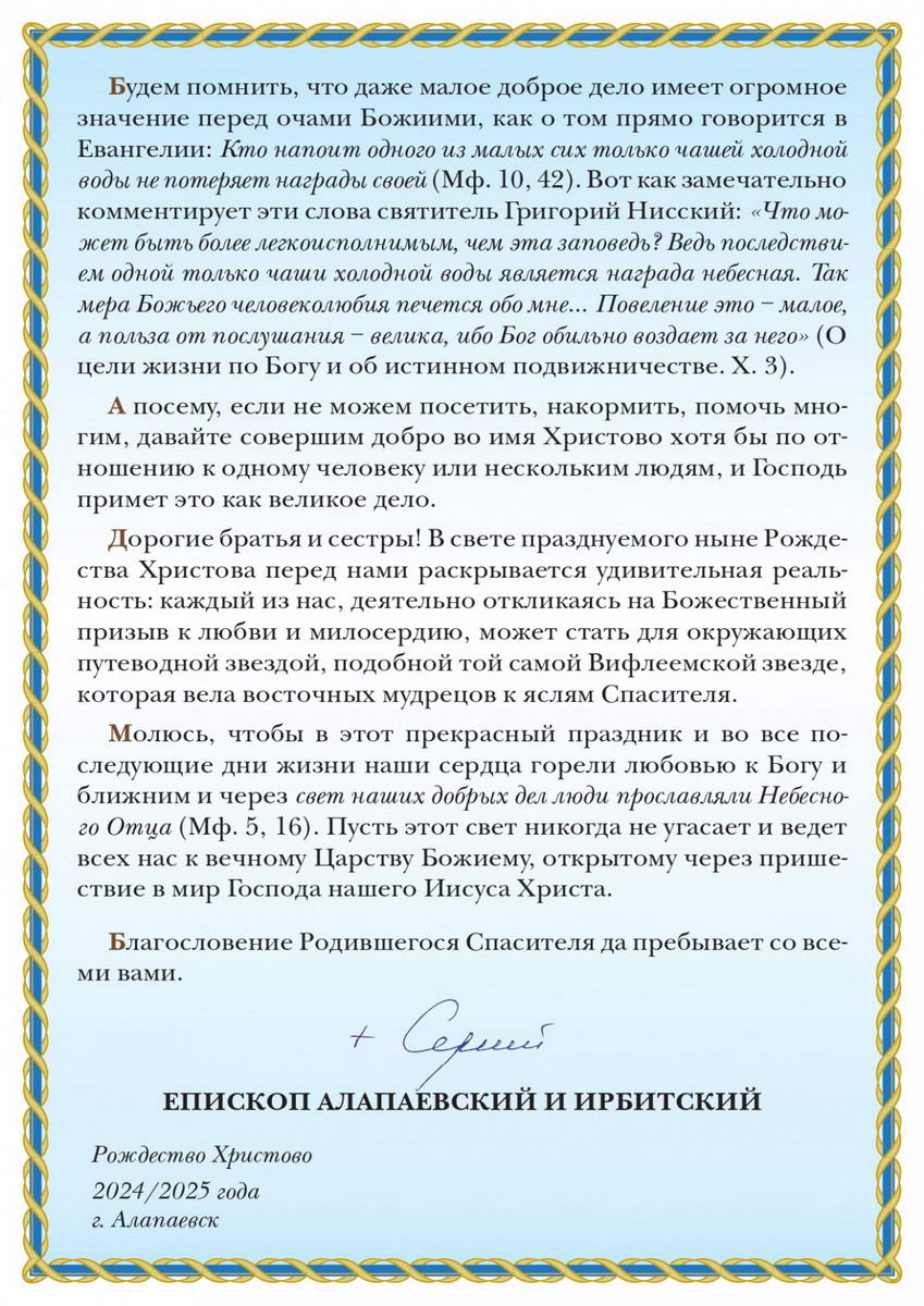 Рождественское послание епископа Алапаевского и Ирбитского СЕРГИЯ пастырям, диаконам, монашествующим и всем верным чадам Алапаевской епархии Русской Православной Церкви Возлюбленные о Господе всечестные пресвитеры и диаконы, боголюбивые иноки и инокини, дорогие братья и сестры!
