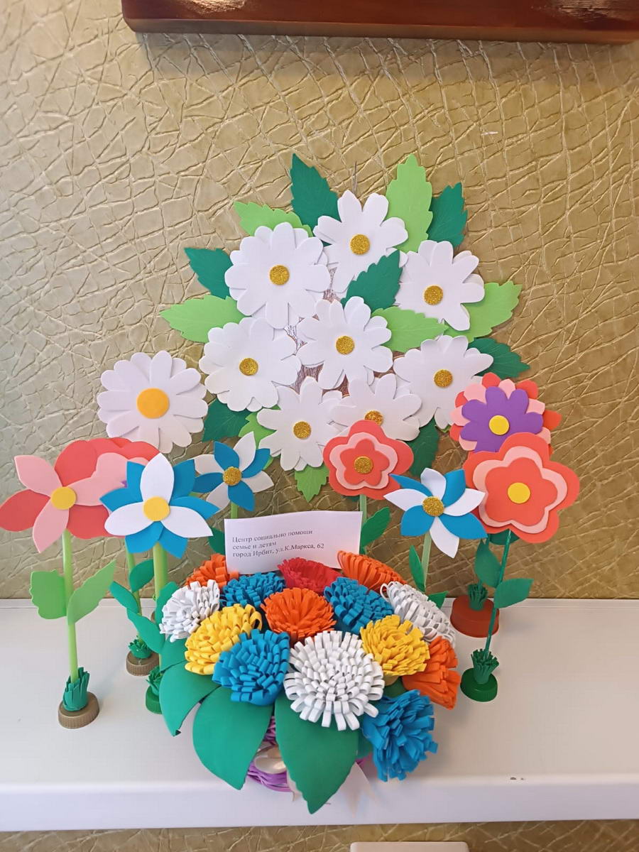 Воспитанники Центра помощи семье и детям, вместе с педагогами нашей воскресной школы, изготовили панно "Ромашки", букет "Цветы в корзине" и цветы на подставке.